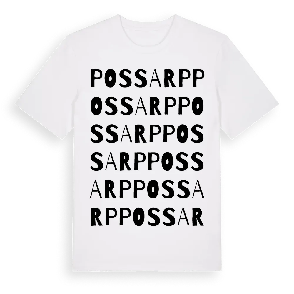 Possarp ordlek t-shirt är inspirerad av Possarp i Jönköpings län, Sverige. Tröjan är designad för dig som har en speciell koppling till platsen – oavsett om du bor här, har rötterna här eller bara älskar Possarp.