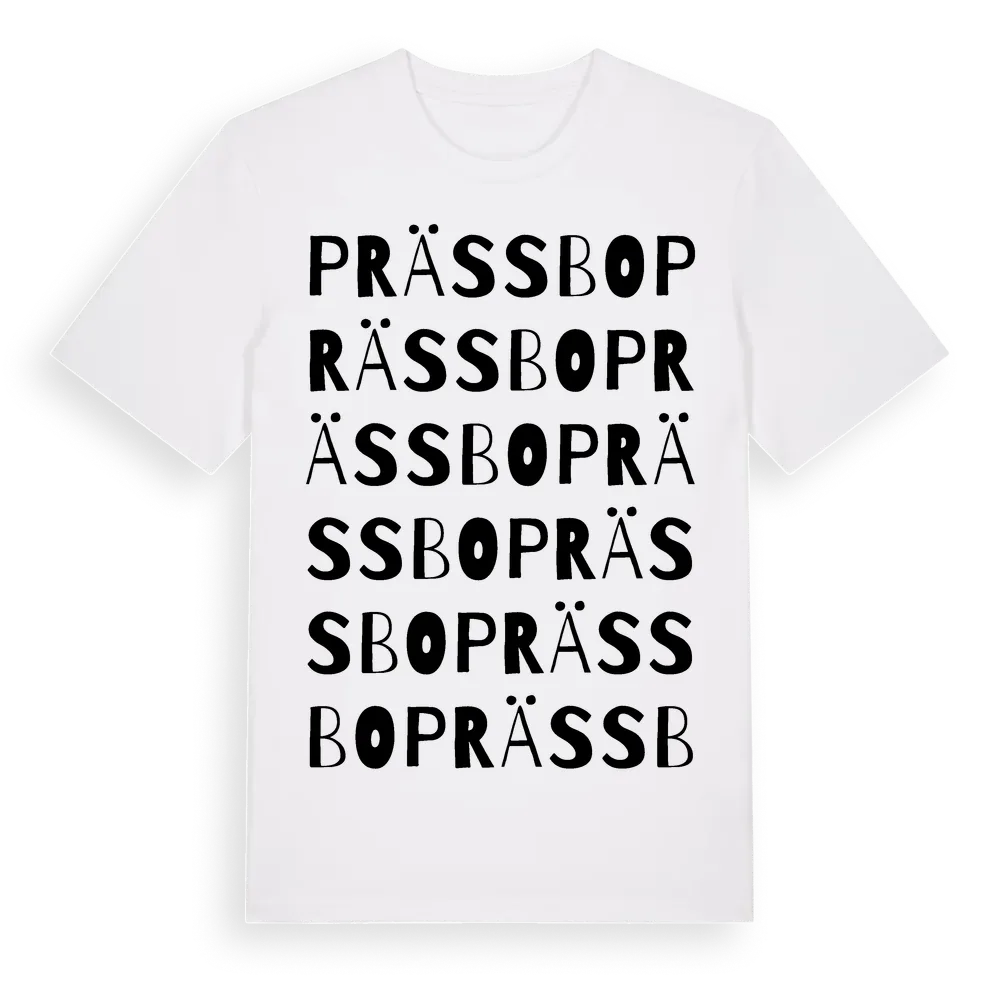 En ordlek byggd på Prässbos namn. Subtilt och klurig – ett motiv som bara de som verkligen känner platsen fullt ut förstår. Premium bomull, unisex – från Prässbo i Jönköpings län.