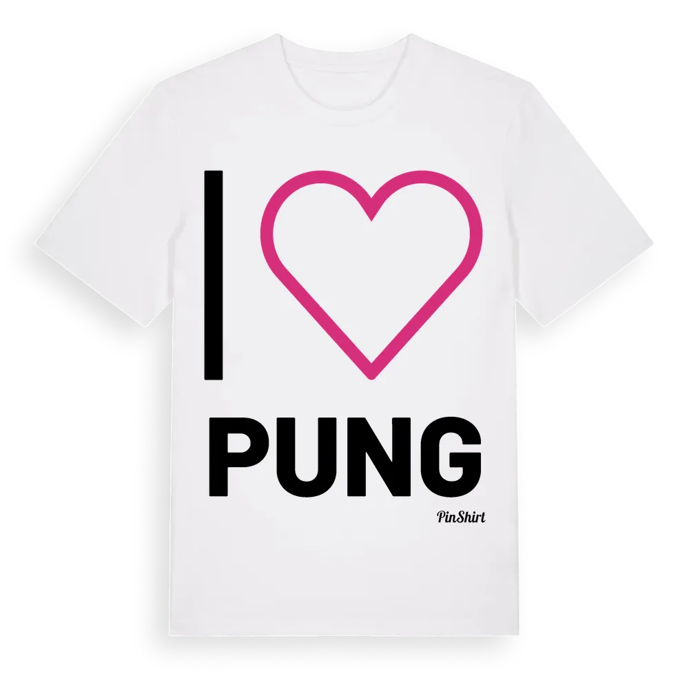 Det klassiska "I ❤ Pung"-motivet i stort format som täcker hela bröstet. För dig som vill visa kärleken till Pung på riktigt. Premium bomull, unisex – från byn Pung i Jönköpings län.
