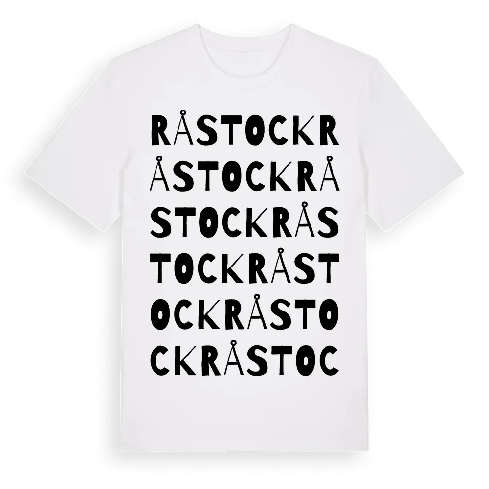 Råstock ordlek t-shirt är inspirerad av Råstock i Jönköpings län, Sverige. Tröjan är designad för dig som har en speciell koppling till platsen – oavsett om du bor här, har rötterna här eller bara älskar Råstock.