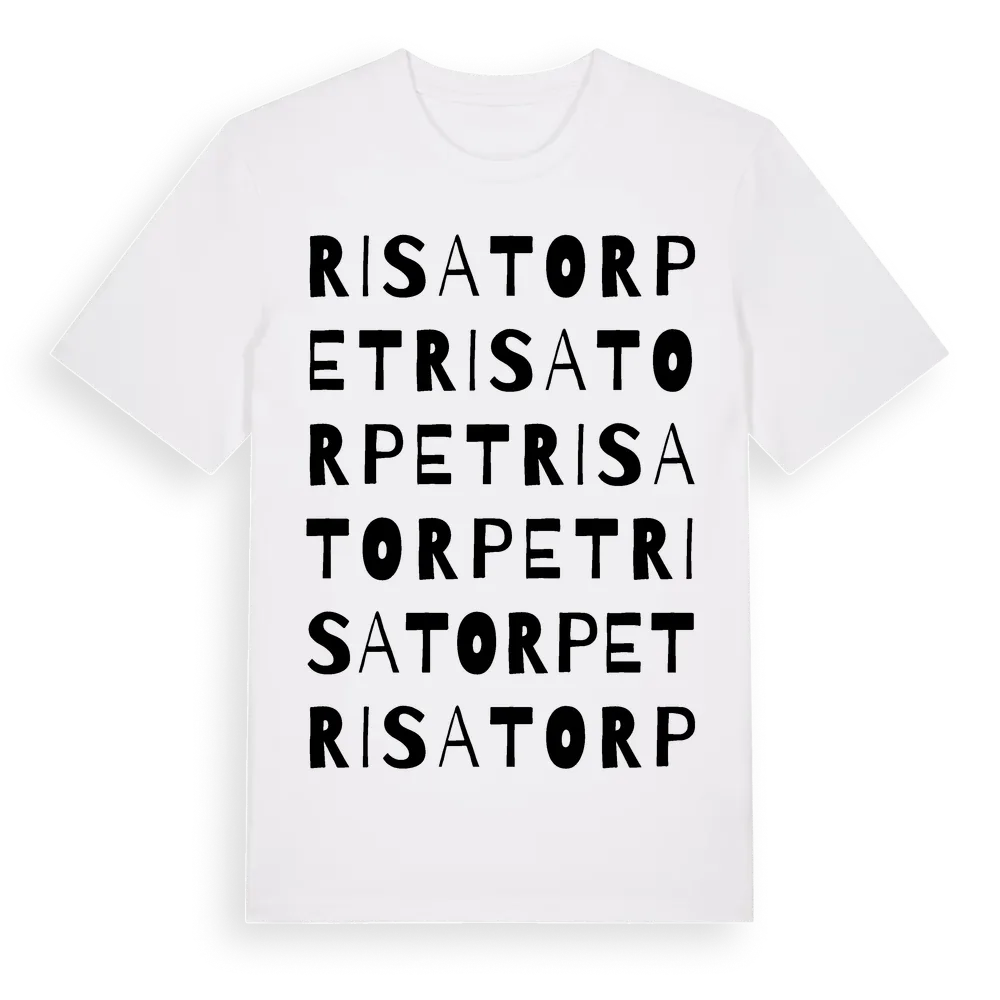 Risatorpet ordlek t-shirt är inspirerad av byn Risatorpet i Jönköpings län, Sverige. Tröjan är designad för dig som har en speciell koppling till platsen – oavsett om du bor här, har rötterna här eller bara älskar Risatorpet.