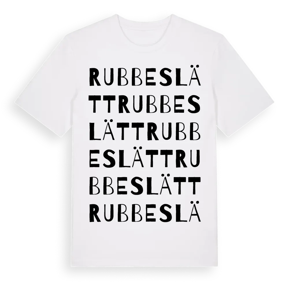 Rubbeslätt ordlek t-shirt är inspirerad av Rubbeslätt i Jönköpings län, Sverige. Tröjan är designad för dig som har en speciell koppling till platsen – oavsett om du bor här, har rötterna här eller bara älskar Rubbeslätt.