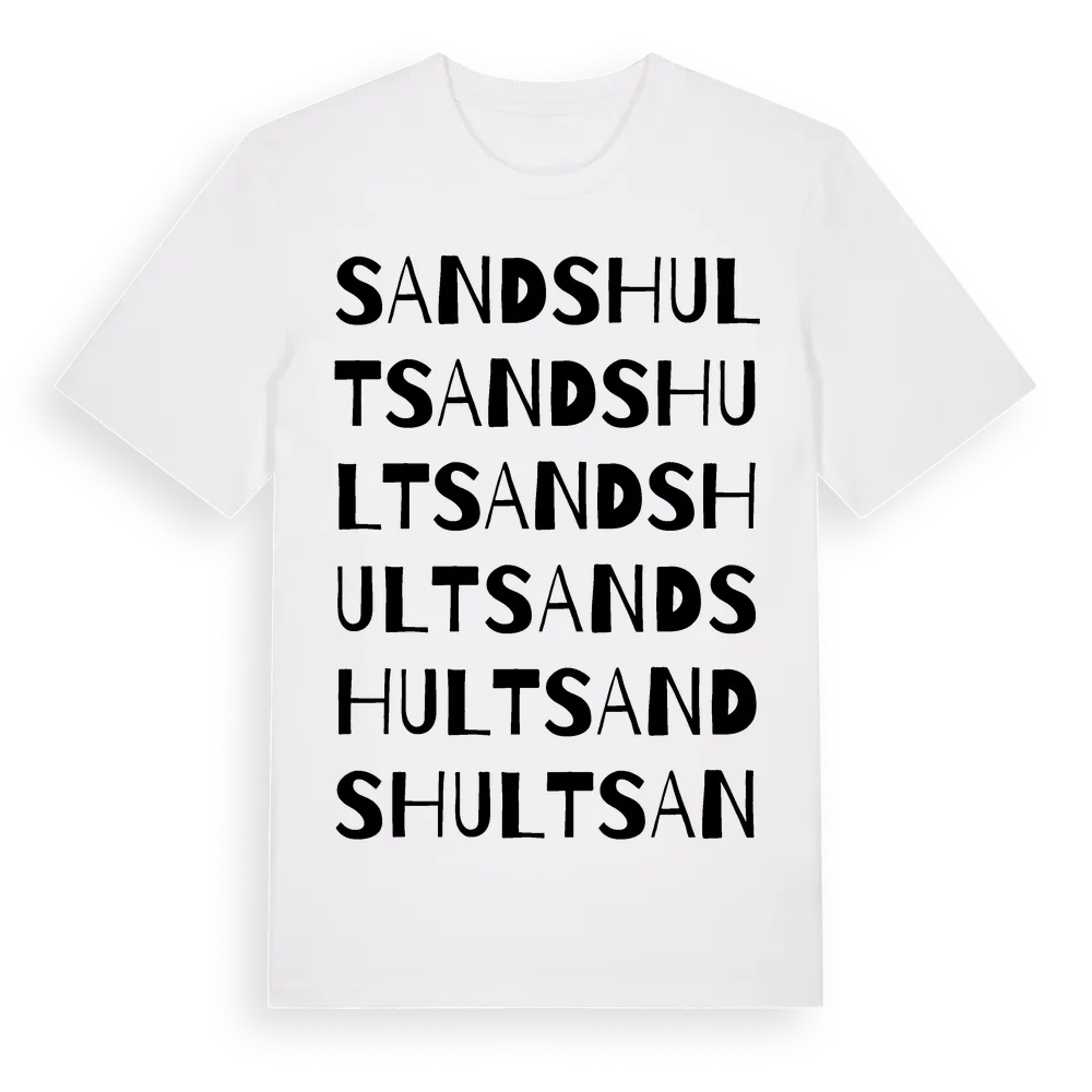 Sandshult ordlek t-shirt är inspirerad av byn Sandshult i Jönköpings län, Sverige. Tröjan är designad för dig som har en speciell koppling till platsen – oavsett om du bor här, har rötterna här eller bara älskar Sandshult.