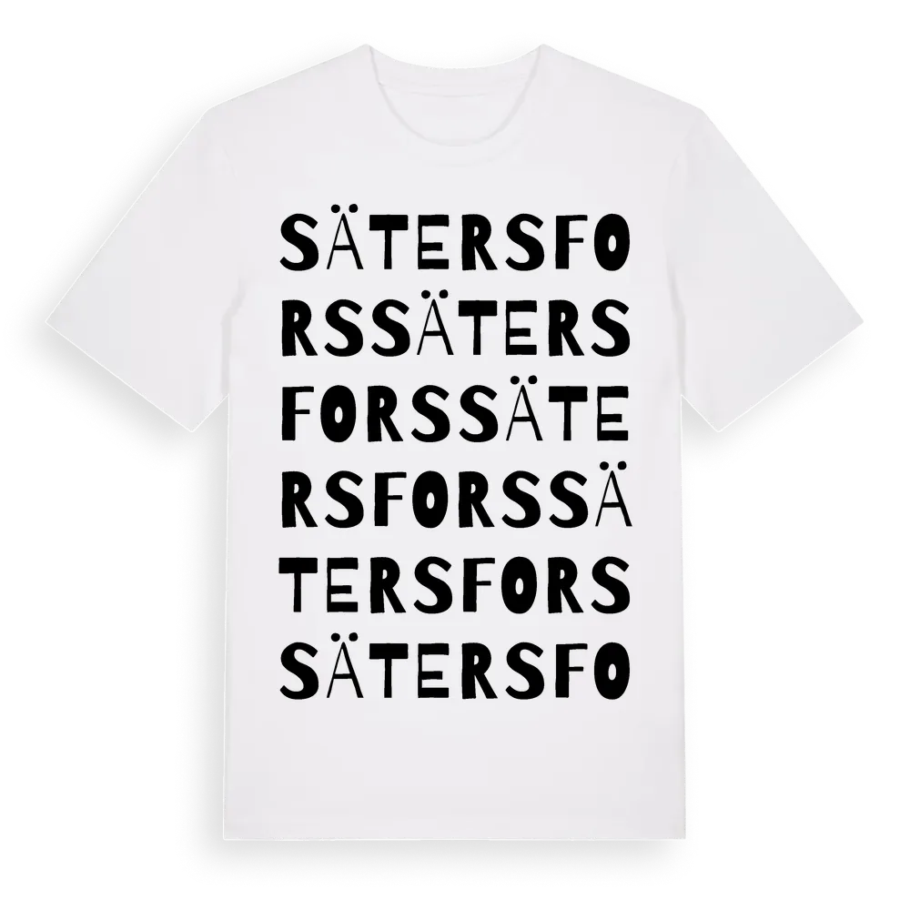 Sätersfors ordlek t-shirt är inspirerad av Sätersfors i Jönköpings län, Sverige. Tröjan är designad för dig som har en speciell koppling till platsen – oavsett om du bor här, har rötterna här eller bara älskar Sätersfors.