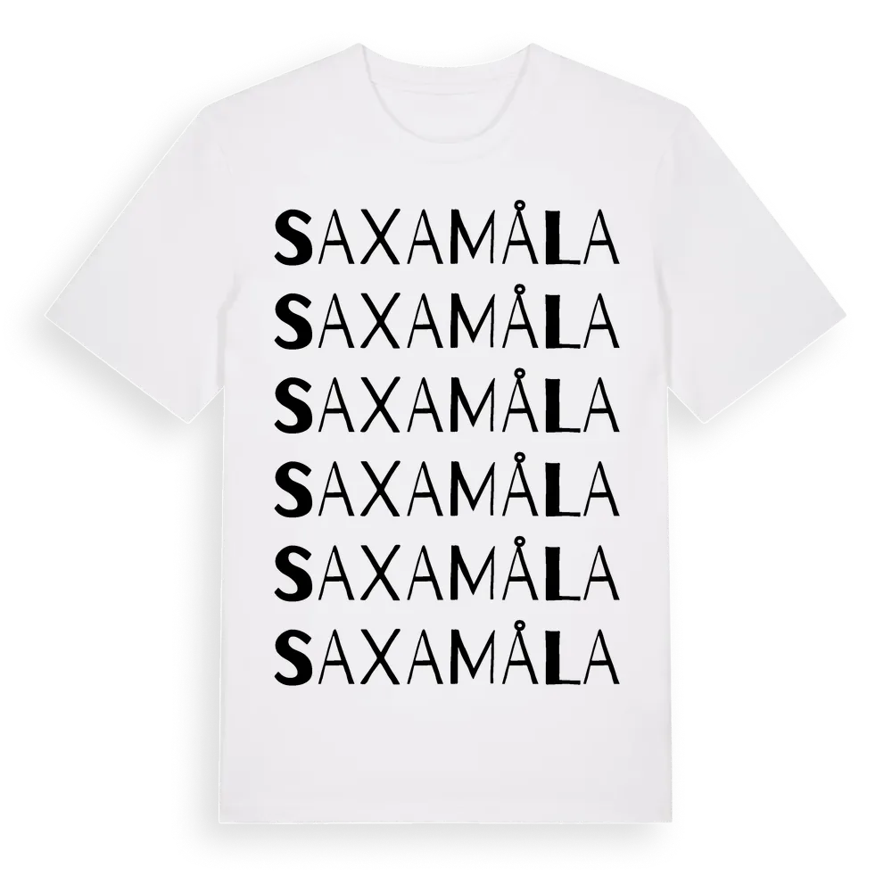 Saxamåla ordlek t-shirt är inspirerad av Saxamåla i Jönköpings län, Sverige. Tröjan är designad för dig som har en speciell koppling till platsen – oavsett om du bor här, har rötterna här eller bara älskar Saxamåla.
