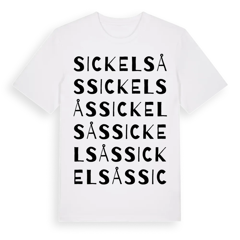 Sickelsås ordlek t-shirt är inspirerad av byn Sickelsås i Jönköpings län, Sverige. Tröjan är designad för dig som har en speciell koppling till platsen – oavsett om du bor här, har rötterna här eller bara älskar Sickelsås.