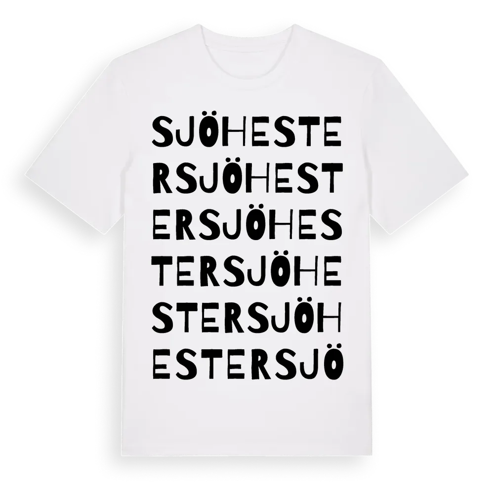 Sjöhester ordlek t-shirt är inspirerad av Sjöhester i Jönköpings län, Sverige. Tröjan är designad för dig som har en speciell koppling till platsen – oavsett om du bor här, har rötterna här eller bara älskar Sjöhester.