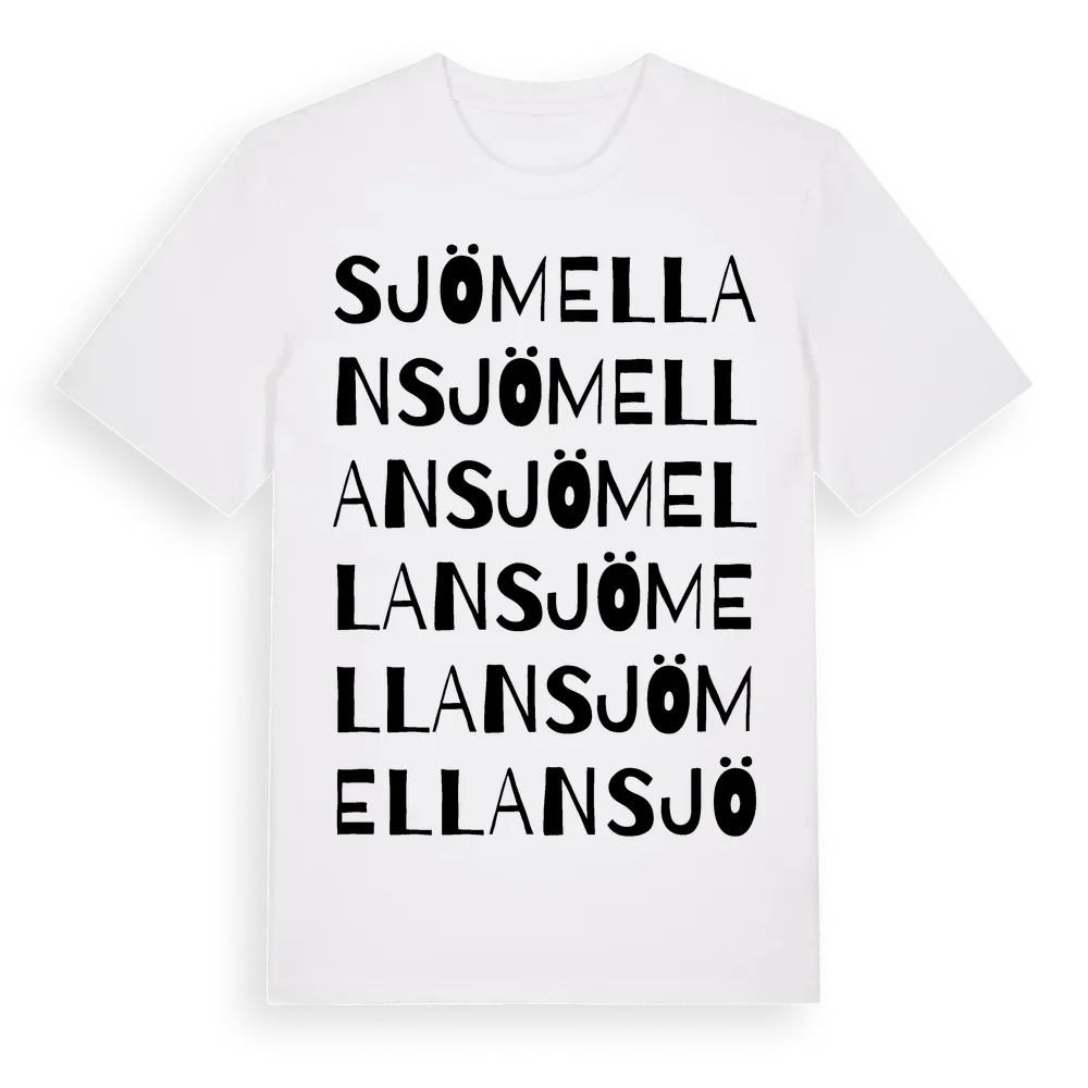 Sjömellan ordlek t-shirt är inspirerad av Sjömellan i Jönköpings län, Sverige. Tröjan är designad för dig som har en speciell koppling till platsen – oavsett om du bor här, har rötterna här eller bara älskar Sjömellan.