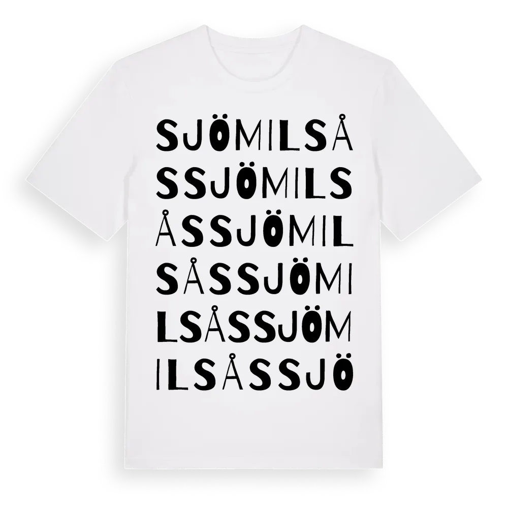 Sjömilsås ordlek t-shirt är inspirerad av byn Sjömilsås i Jönköpings län, Sverige. Tröjan är designad för dig som har en speciell koppling till platsen – oavsett om du bor här, har rötterna här eller bara älskar Sjömilsås.