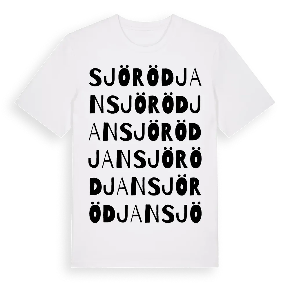Sjörödjan ordlek t-shirt är inspirerad av Sjörödjan i Jönköpings län, Sverige. Tröjan är designad för dig som har en speciell koppling till platsen – oavsett om du bor här, har rötterna här eller bara älskar Sjörödjan.