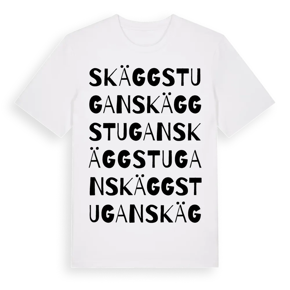 Skäggstugan ordlek t-shirt är inspirerad av Skäggstugan i Jönköpings län, Sverige. Tröjan är designad för dig som har en speciell koppling till platsen – oavsett om du bor här, har rötterna här eller bara älskar Skäggstugan.