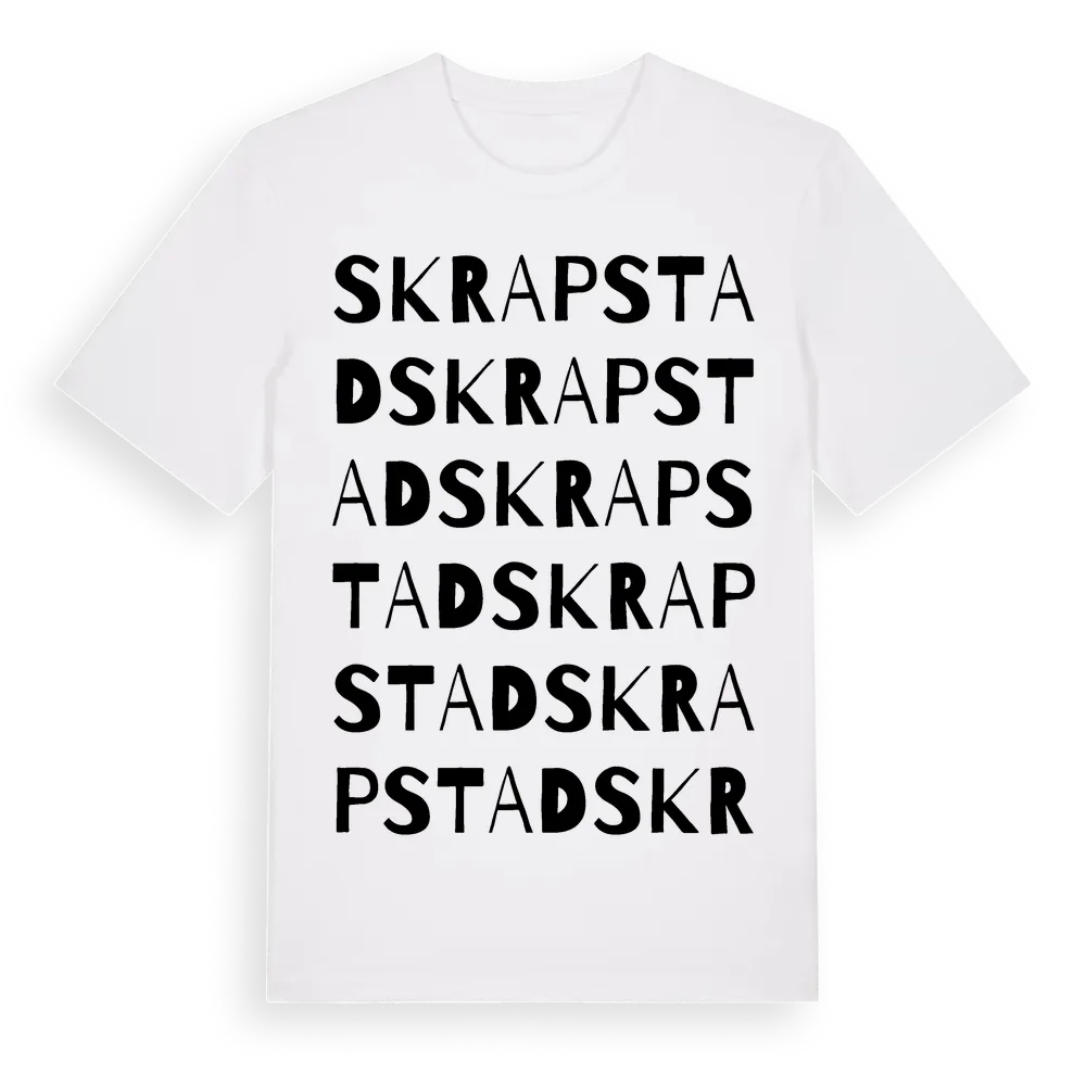 Skrapstad ordlek t-shirt är inspirerad av byn Skrapstad i Jönköpings län, Sverige. Tröjan är designad för dig som har en speciell koppling till platsen – oavsett om du bor här, har rötterna här eller bara älskar Skrapstad.