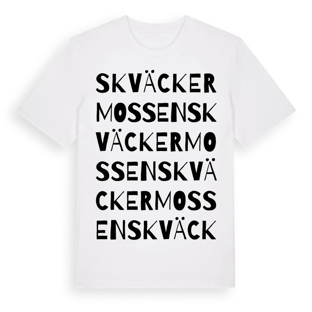 Skväckermossen ordlek t-shirt är inspirerad av Skväckermossen i Jönköpings län, Sverige. Tröjan är designad för dig som har en speciell koppling till platsen – oavsett om du bor här, har rötterna här eller bara älskar Skväckermossen.