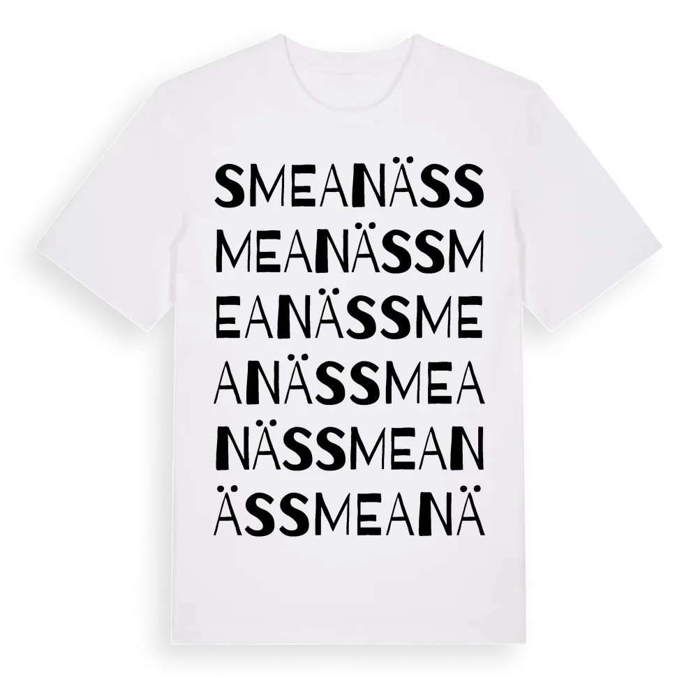 Smeanäs ordlek t-shirt är inspirerad av Smeanäs i Jönköpings län, Sverige. Tröjan är designad för dig som har en speciell koppling till platsen – oavsett om du bor här, har rötterna här eller bara älskar Smeanäs.