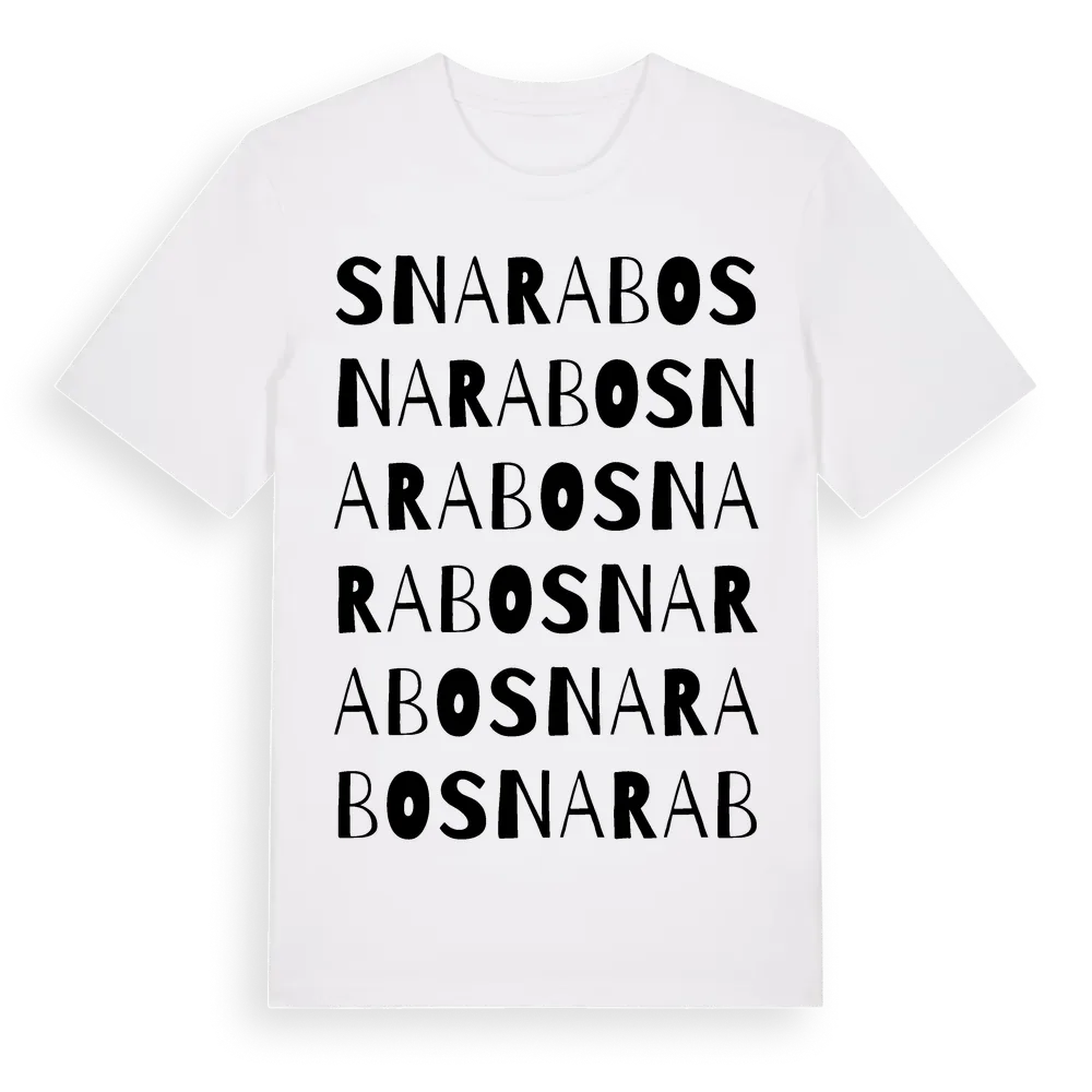 Snarabo ordlek t-shirt är inspirerad av Snarabo i Jönköpings län, Sverige. Tröjan är designad för dig som har en speciell koppling till platsen – oavsett om du bor här, har rötterna här eller bara älskar Snarabo.