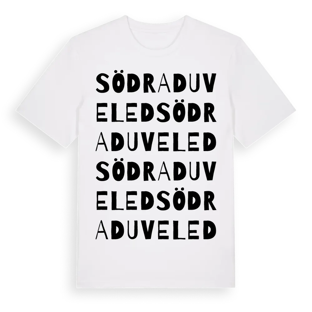 Södra Duveled ordlek t-shirt är inspirerad av Södra Duveled i Jönköpings län, Sverige. Tröjan är designad för dig som har en speciell koppling till platsen – oavsett om du bor här, har rötterna här eller bara älskar Södra Duveled.