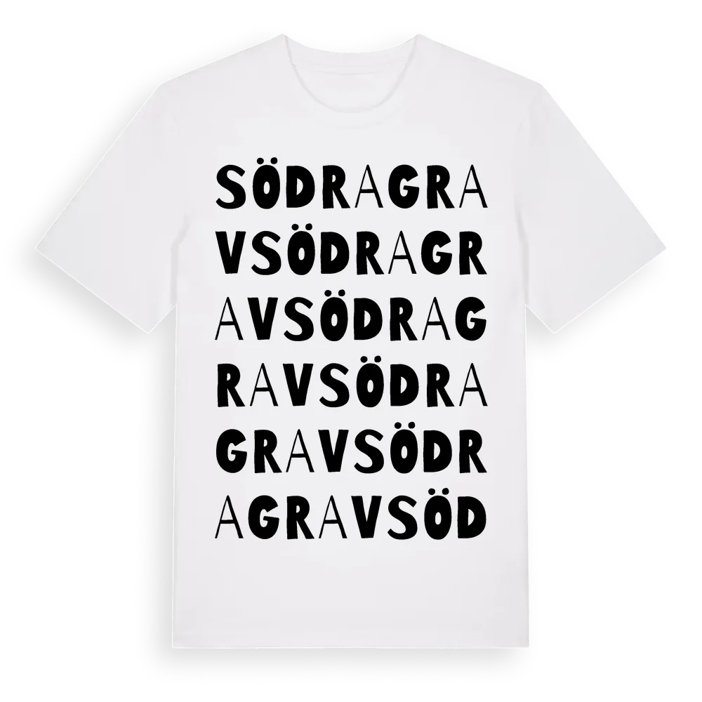 Södra Grav ordlek t-shirt är inspirerad av Södra Grav i Jönköpings län, Sverige. Tröjan är designad för dig som har en speciell koppling till platsen – oavsett om du bor här, har rötterna här eller bara älskar Södra Grav.