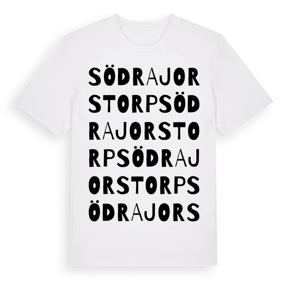 Södra Jorstorp ordlek t-shirt är inspirerad av Södra Jorstorp i Jönköpings län, Sverige. Tröjan är designad för dig som har en speciell koppling till platsen – oavsett om du bor här, har rötterna här eller bara älskar Södra Jorstorp.