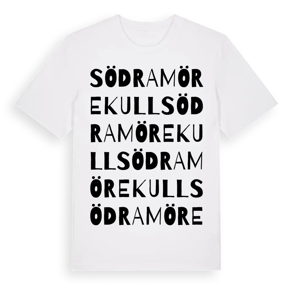 Södra Mörekull ordlek t-shirt är inspirerad av byn Södra Mörekull i Jönköpings län, Sverige. Tröjan är designad för dig som har en speciell koppling till platsen – oavsett om du bor här, har rötterna här eller bara älskar Södra Mörekull.