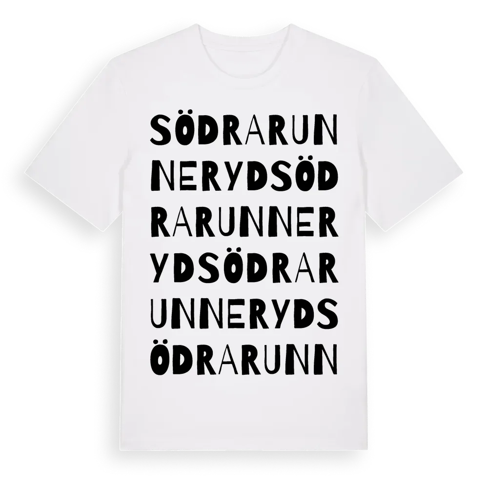 Södra Runneryd ordlek t-shirt är inspirerad av byn Södra Runneryd i Jönköpings län, Sverige. Tröjan är designad för dig som har en speciell koppling till platsen – oavsett om du bor här, har rötterna här eller bara älskar Södra Runneryd.