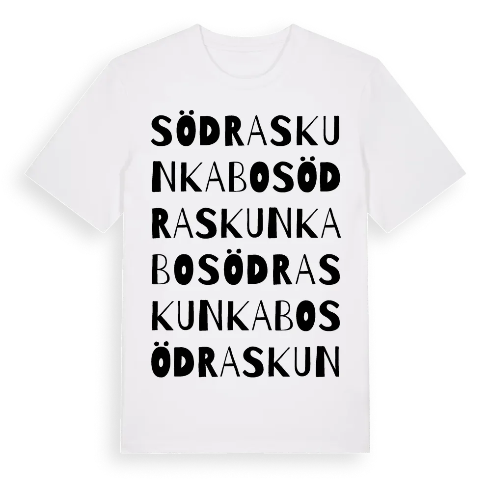 Södra Skunkabo ordlek t-shirt är inspirerad av byn Södra Skunkabo i Jönköpings län, Sverige. Tröjan är designad för dig som har en speciell koppling till platsen – oavsett om du bor här, har rötterna här eller bara älskar Södra Skunkabo.