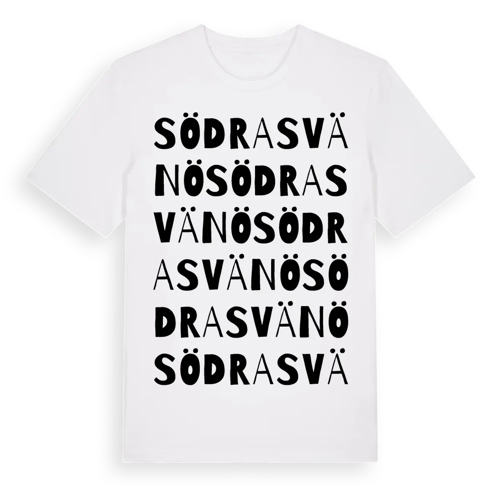 Södra Svänö ordlek t-shirt är inspirerad av Södra Svänö i Jönköpings län, Sverige. Tröjan är designad för dig som har en speciell koppling till platsen – oavsett om du bor här, har rötterna här eller bara älskar Södra Svänö.