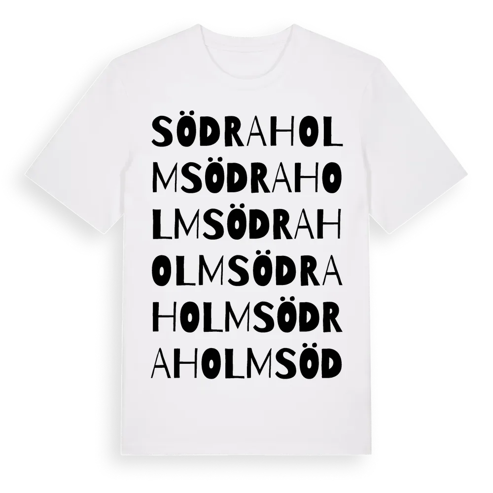 Södraholm ordlek t-shirt är inspirerad av byn Södraholm i Jönköpings län, Sverige. Tröjan är designad för dig som har en speciell koppling till platsen – oavsett om du bor här, har rötterna här eller bara älskar Södraholm.