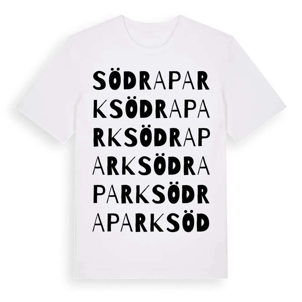 Södrapark ordlek t-shirt är inspirerad av stadsdelen Södrapark i Jönköpings län, Sverige. Tröjan är designad för dig som har en speciell koppling till platsen – oavsett om du bor här, har rötterna här eller bara älskar Södrapark.