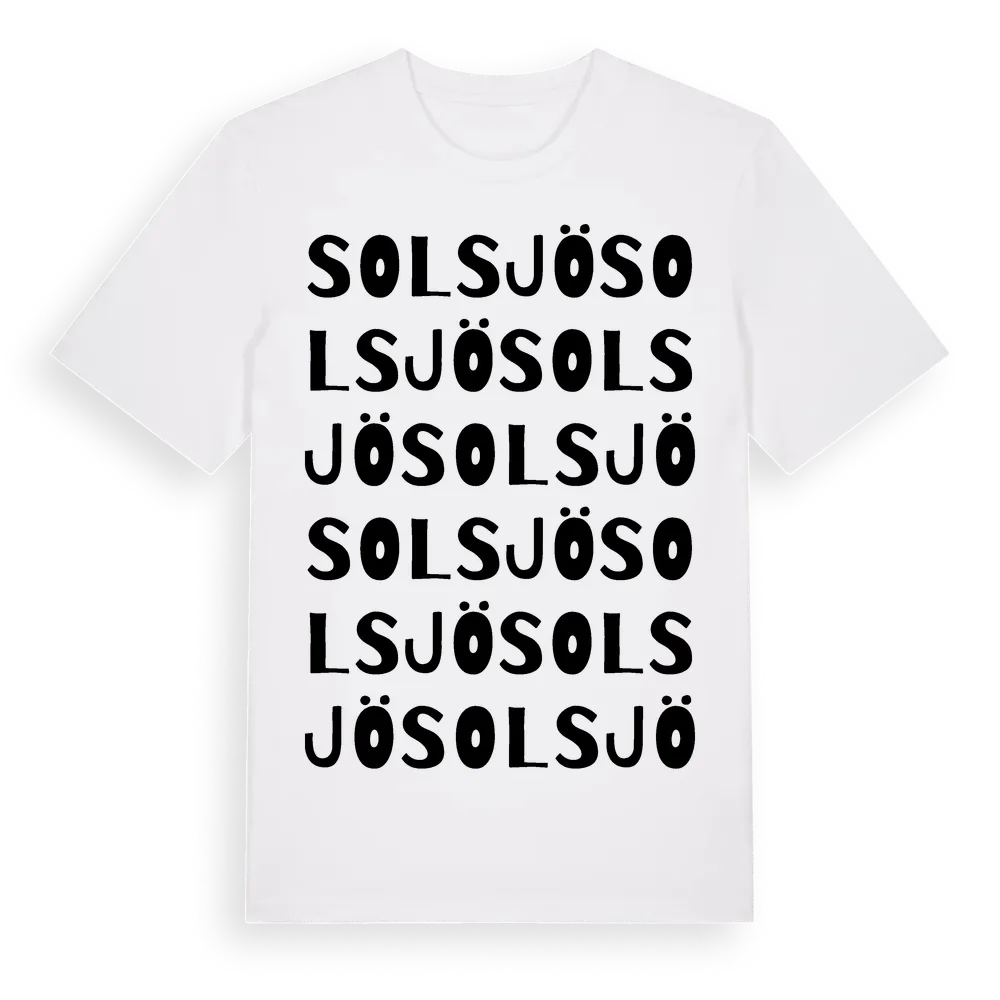Solsjö ordlek t-shirt är inspirerad av byn Solsjö i Jönköpings län, Sverige. Tröjan är designad för dig som har en speciell koppling till platsen – oavsett om du bor här, har rötterna här eller bara älskar Solsjö.