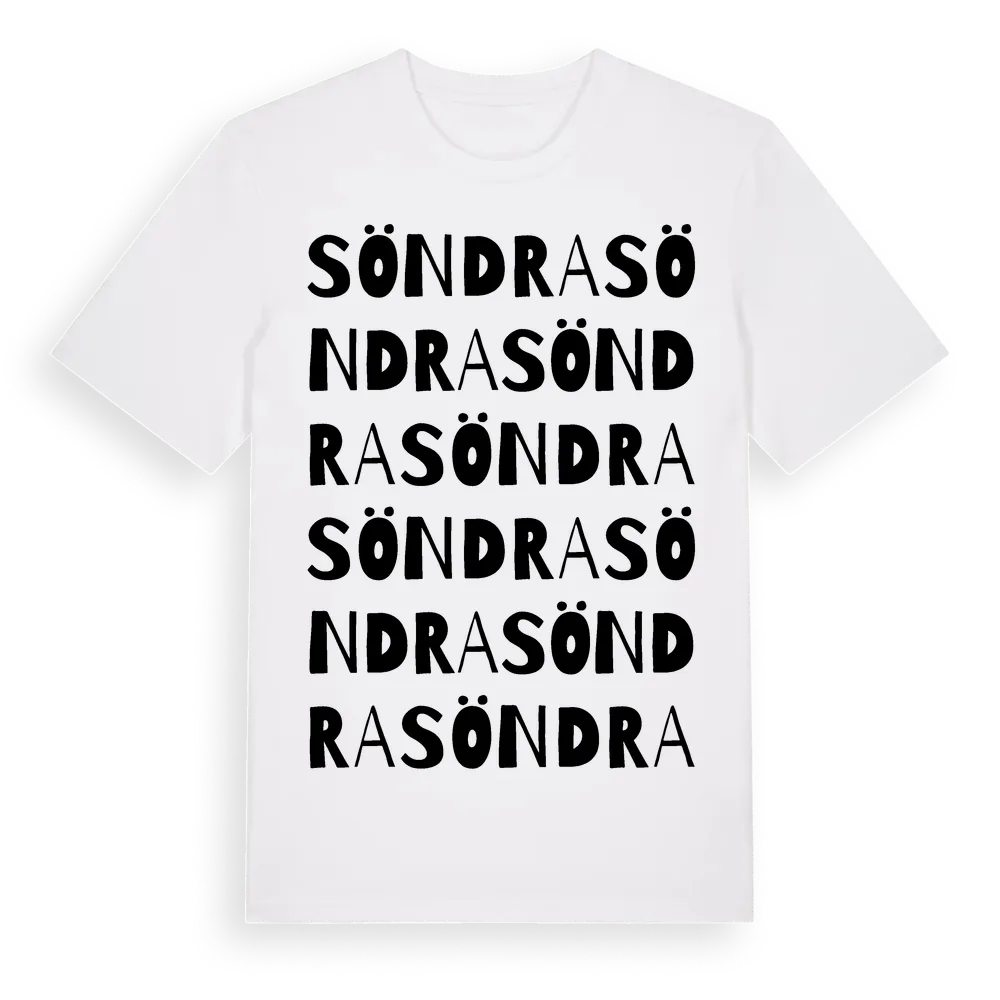 Söndra ordlek t-shirt är inspirerad av byn Söndra i Jönköpings län, Sverige. Tröjan är designad för dig som har en speciell koppling till platsen – oavsett om du bor här, har rötterna här eller bara älskar Söndra.