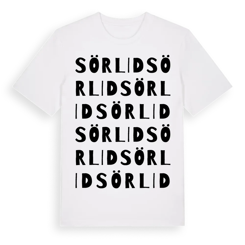 Sörlid ordlek t-shirt är inspirerad av Sörlid i Jönköpings län, Sverige. Tröjan är designad för dig som har en speciell koppling till platsen – oavsett om du bor här, har rötterna här eller bara älskar Sörlid.