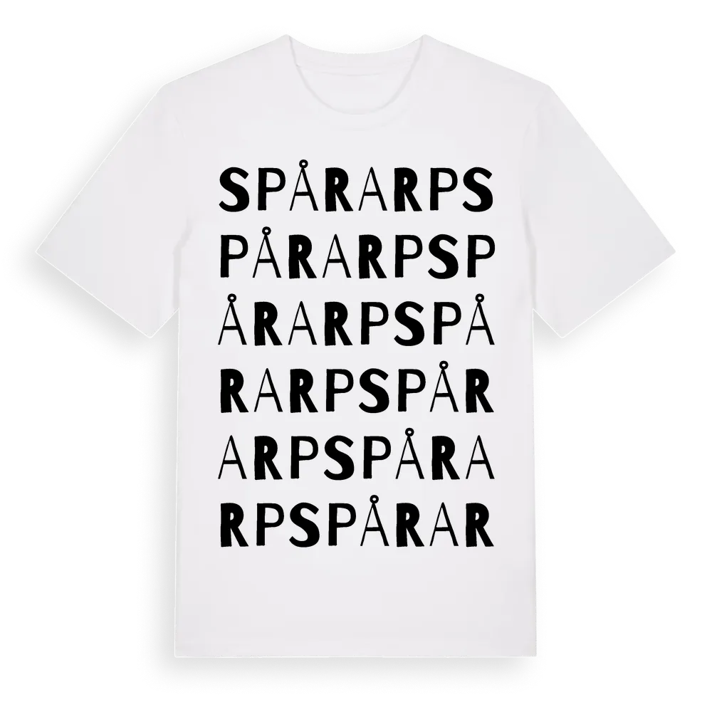 Spårarp ordlek t-shirt är inspirerad av Spårarp i Jönköpings län, Sverige. Tröjan är designad för dig som har en speciell koppling till platsen – oavsett om du bor här, har rötterna här eller bara älskar Spårarp.