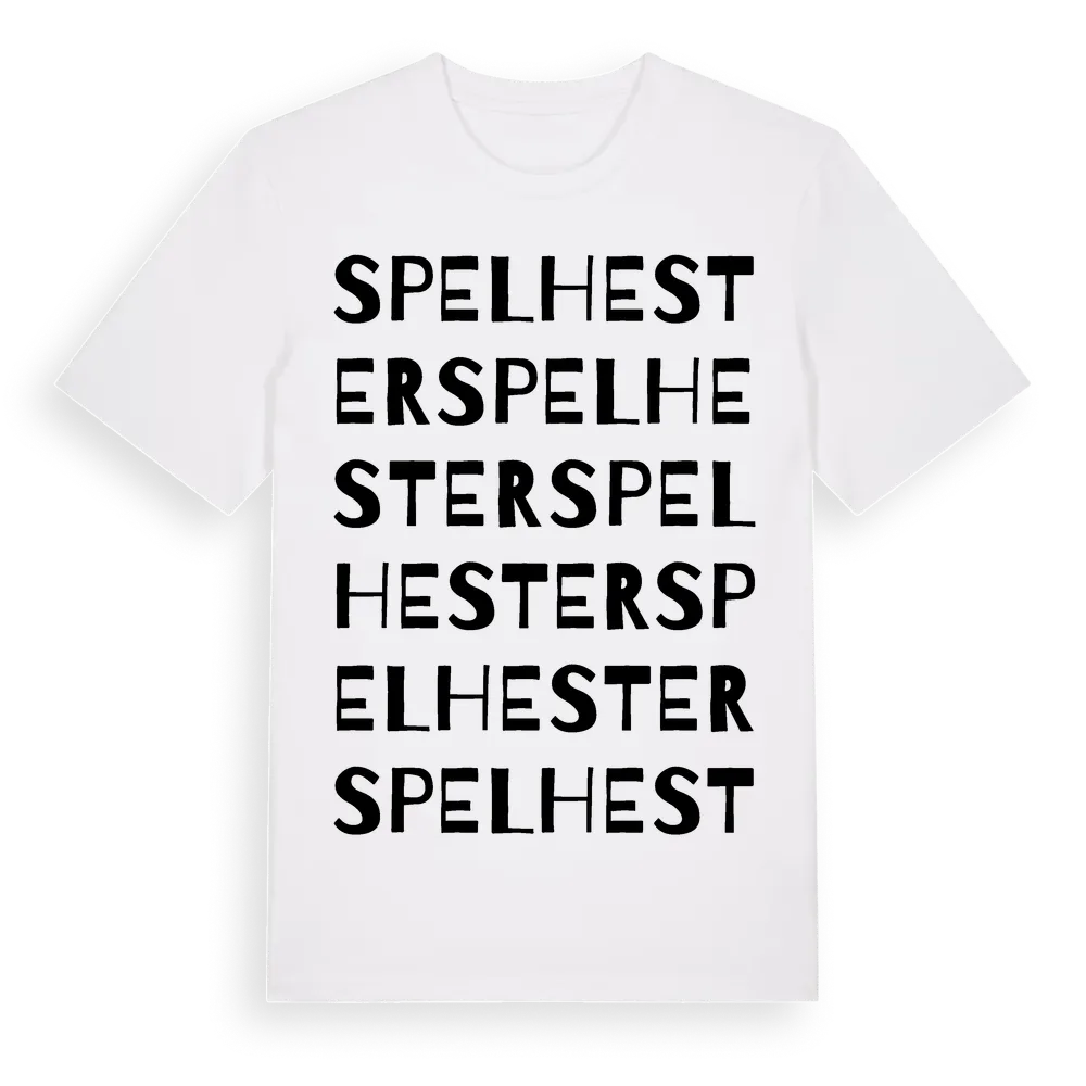 Spelhester ordlek t-shirt är inspirerad av Spelhester i Jönköpings län, Sverige. Tröjan är designad för dig som har en speciell koppling till platsen – oavsett om du bor här, har rötterna här eller bara älskar Spelhester.