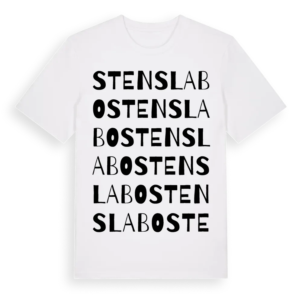 Stenslabo ordlek t-shirt är inspirerad av Stenslabo i Jönköpings län, Sverige. Tröjan är designad för dig som har en speciell koppling till platsen – oavsett om du bor här, har rötterna här eller bara älskar Stenslabo.