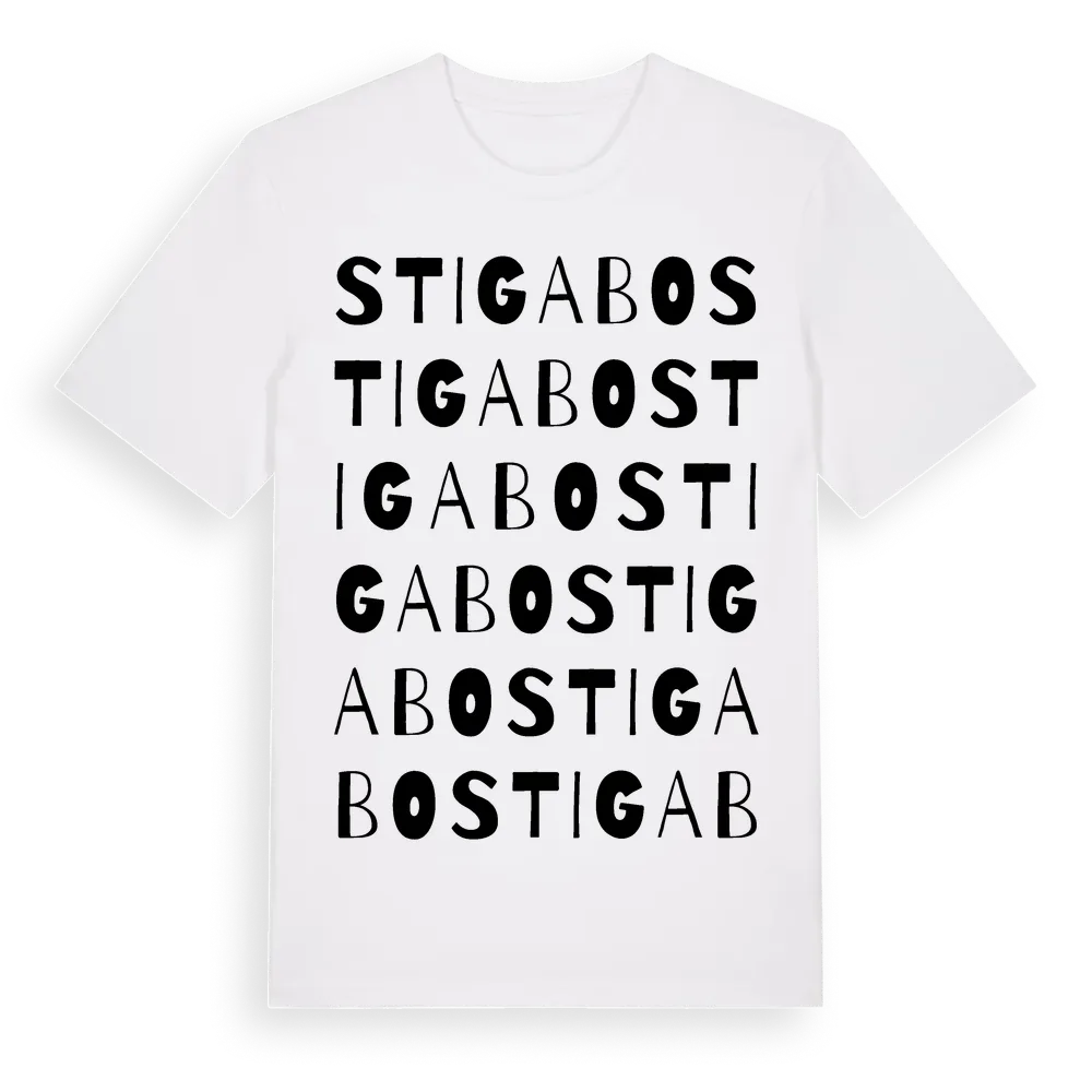 Stigabo ordlek t-shirt är inspirerad av Stigabo i Jönköpings län, Sverige. Tröjan är designad för dig som har en speciell koppling till platsen – oavsett om du bor här, har rötterna här eller bara älskar Stigabo.