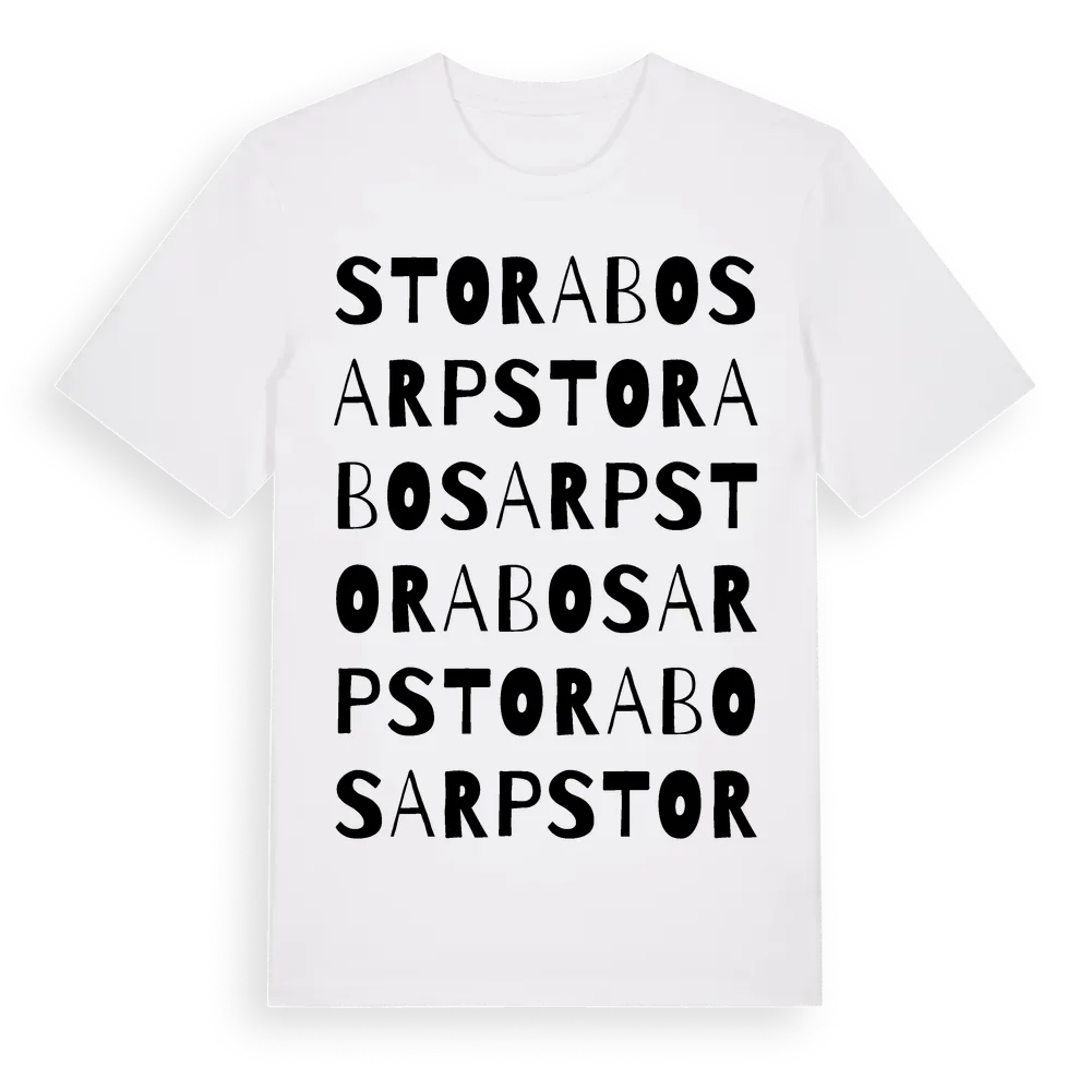 Stora Bosarp ordlek t-shirt är inspirerad av Stora Bosarp i Jönköpings län, Sverige. Tröjan är designad för dig som har en speciell koppling till platsen – oavsett om du bor här, har rötterna här eller bara älskar Stora Bosarp.