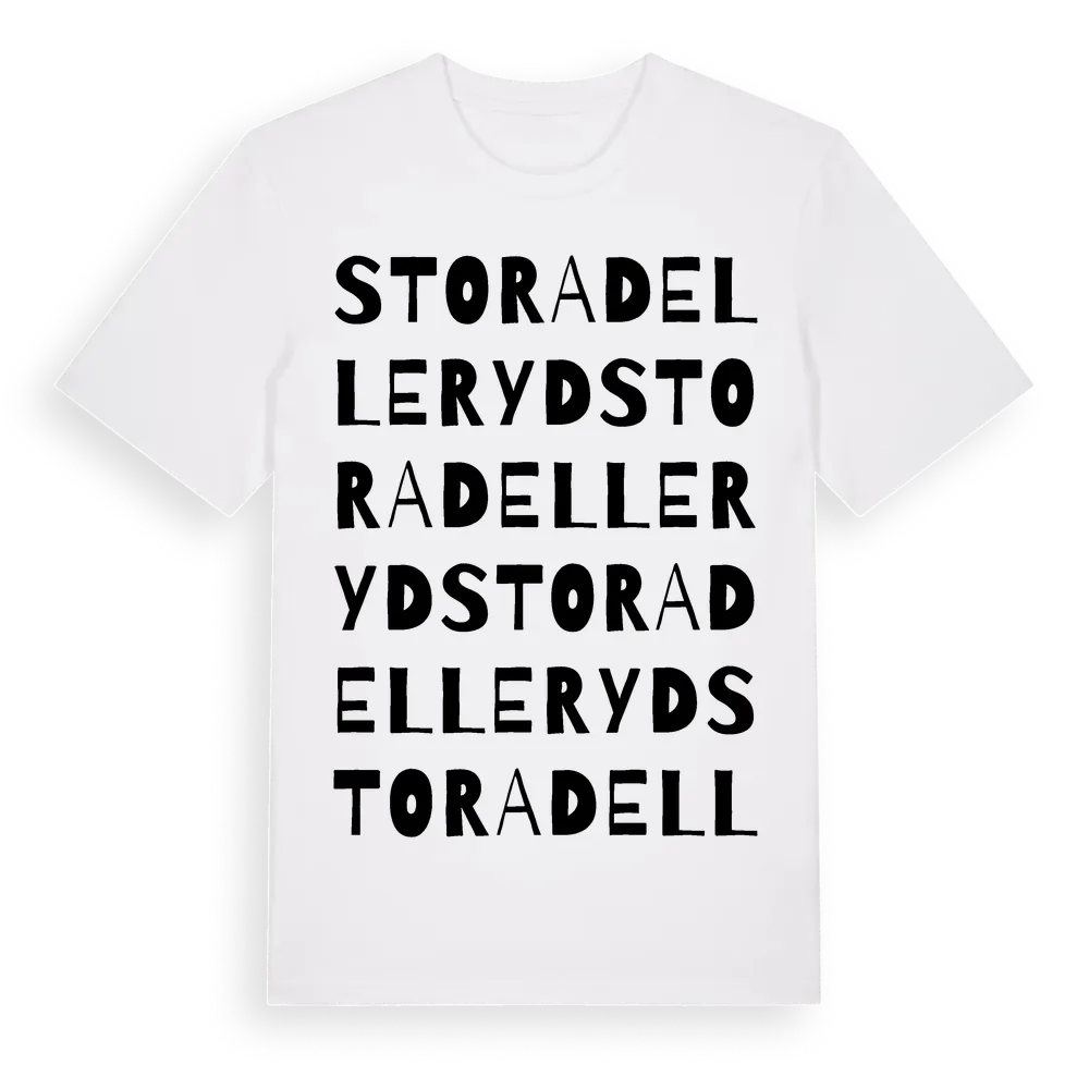 Stora Delleryd ordlek t-shirt är inspirerad av byn Stora Delleryd i Jönköpings län, Sverige. Tröjan är designad för dig som har en speciell koppling till platsen – oavsett om du bor här, har rötterna här eller bara älskar Stora Delleryd.