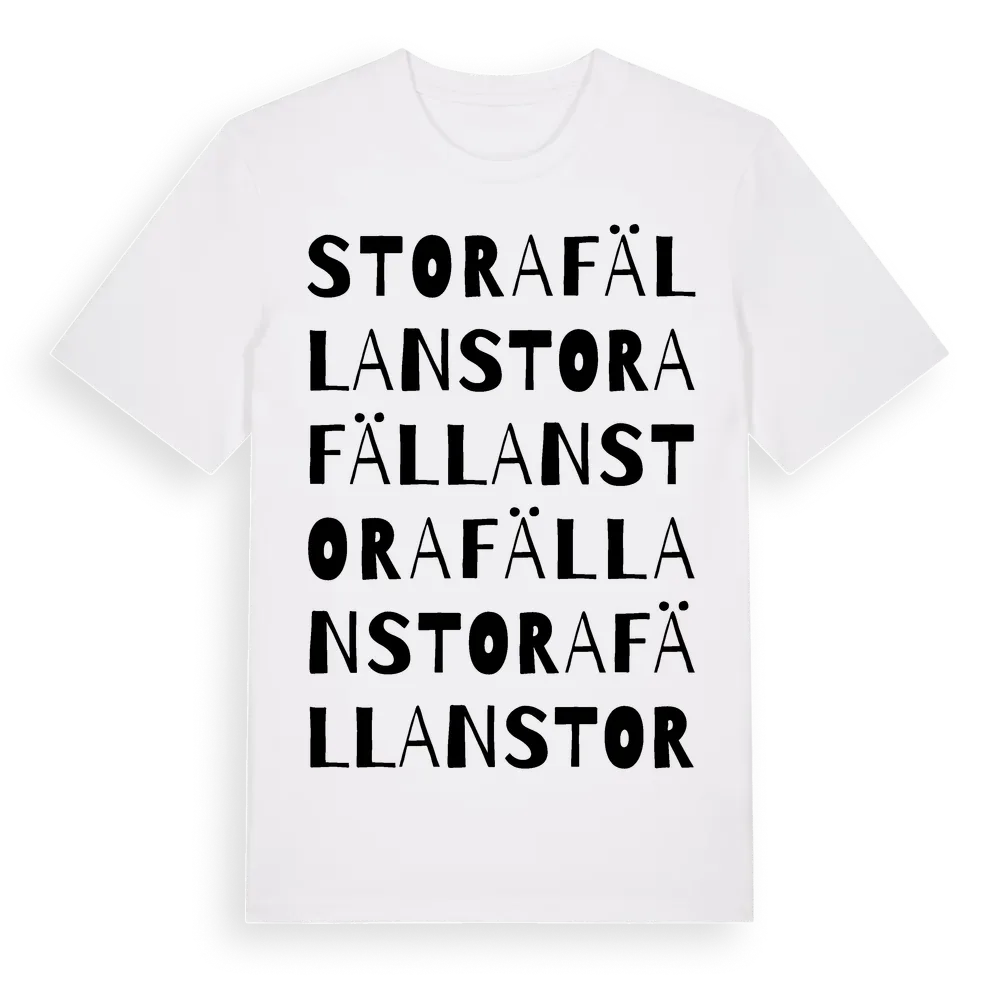 Stora Fällan ordlek t-shirt är inspirerad av Stora Fällan i Jönköpings län, Sverige. Tröjan är designad för dig som har en speciell koppling till platsen – oavsett om du bor här, har rötterna här eller bara älskar Stora Fällan.