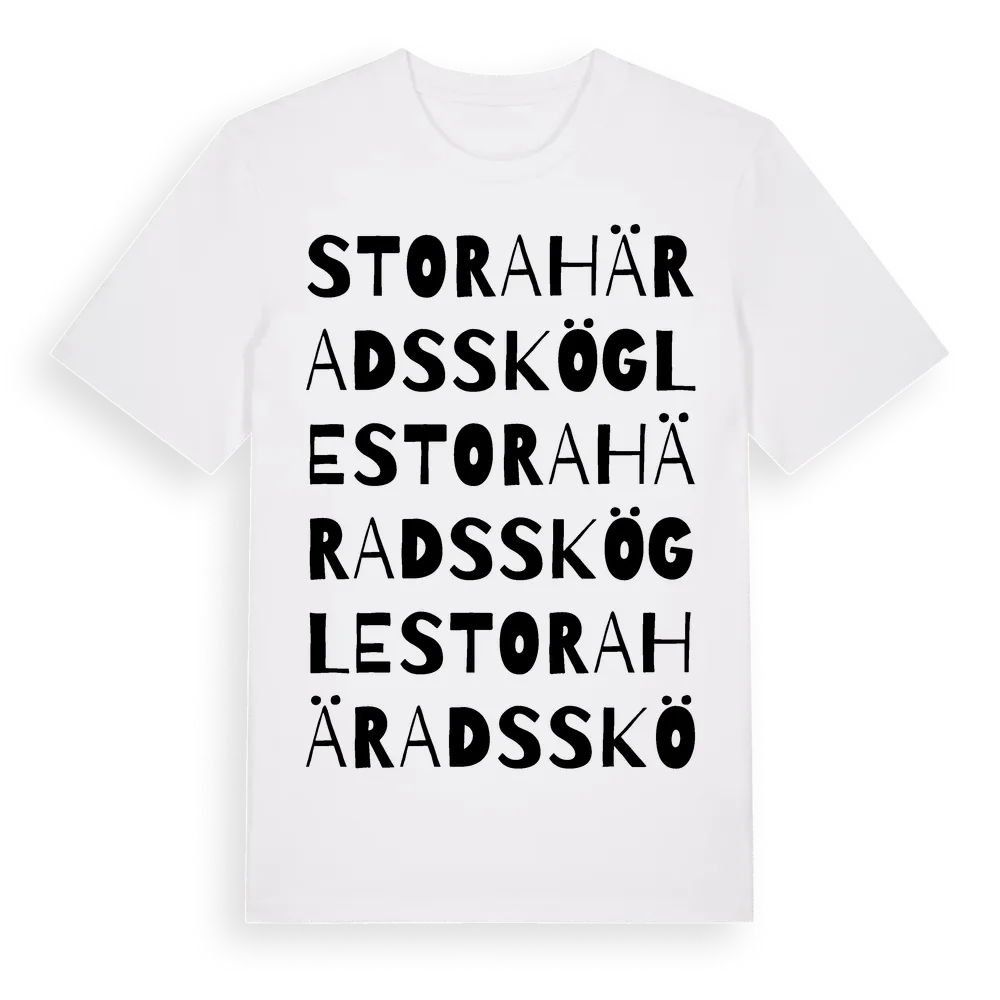 Stora Häradsskögle ordlek t-shirt är inspirerad av byn Stora Häradsskögle i Jönköpings län, Sverige. Tröjan är designad för dig som har en speciell koppling till platsen – oavsett om du bor här, har rötterna här eller bara älskar Stora Häradsskögle.
