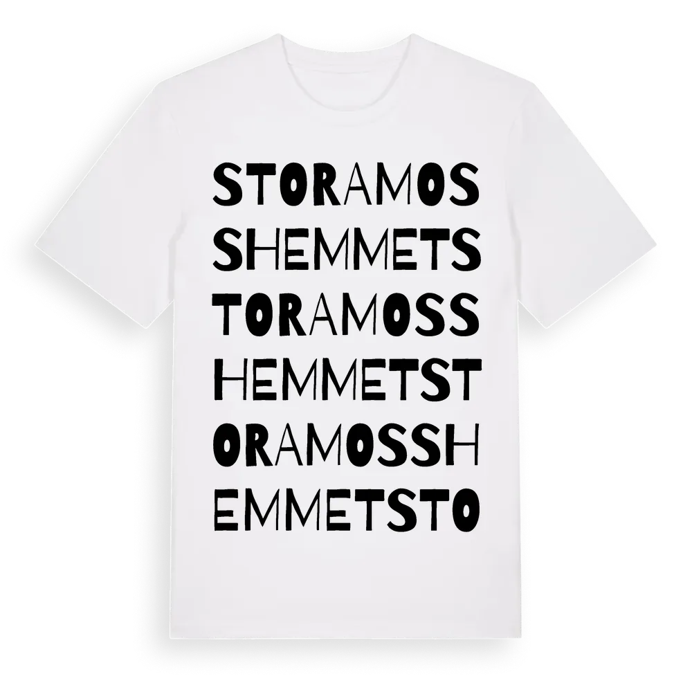 Stora Mosshemmet ordlek t-shirt är inspirerad av Stora Mosshemmet i Jönköpings län, Sverige. Tröjan är designad för dig som har en speciell koppling till platsen – oavsett om du bor här, har rötterna här eller bara älskar Stora Mosshemmet.
