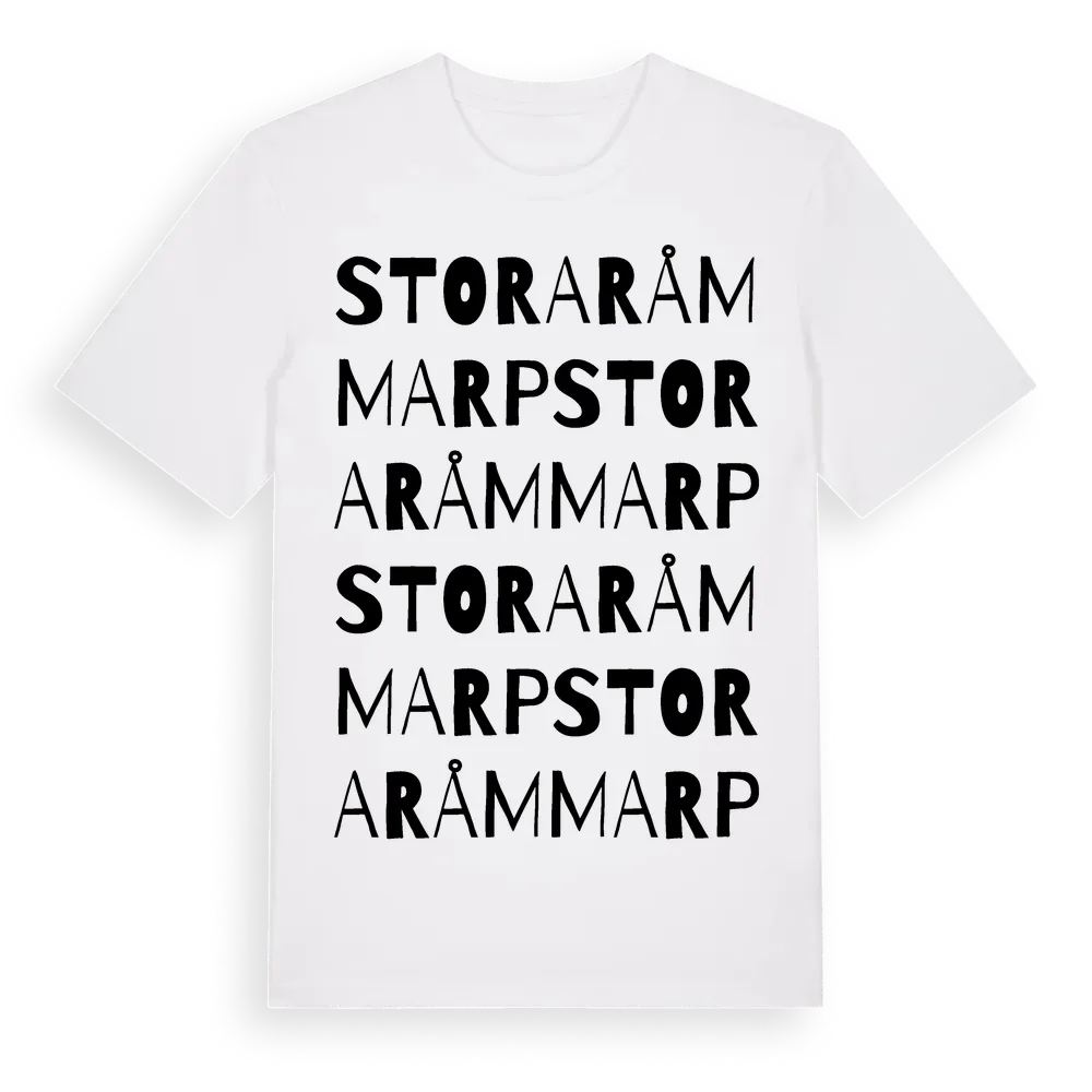 Stora Råmmarp ordlek t-shirt är inspirerad av Stora Råmmarp i Jönköpings län, Sverige. Tröjan är designad för dig som har en speciell koppling till platsen – oavsett om du bor här, har rötterna här eller bara älskar Stora Råmmarp.