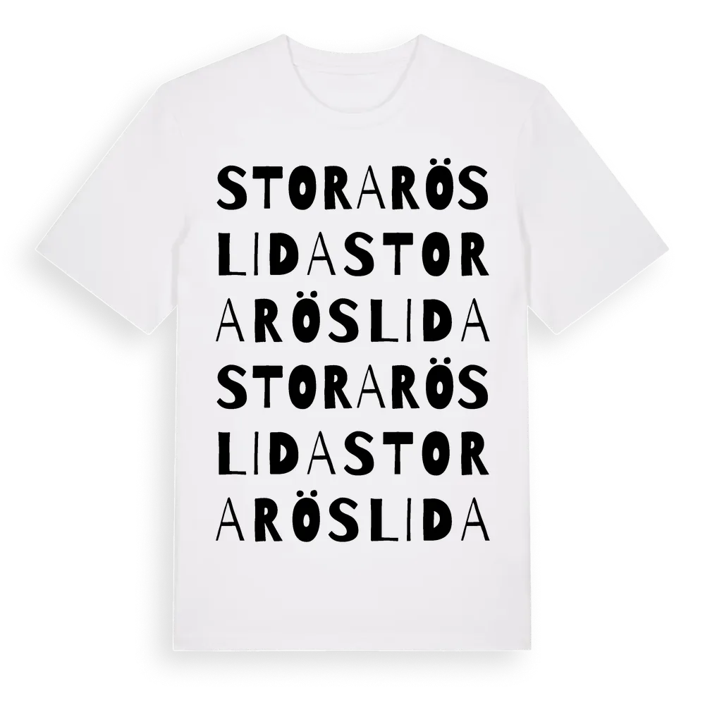 Stora Röslida ordlek t-shirt är inspirerad av Stora Röslida i Jönköpings län, Sverige. Tröjan är designad för dig som har en speciell koppling till platsen – oavsett om du bor här, har rötterna här eller bara älskar Stora Röslida.