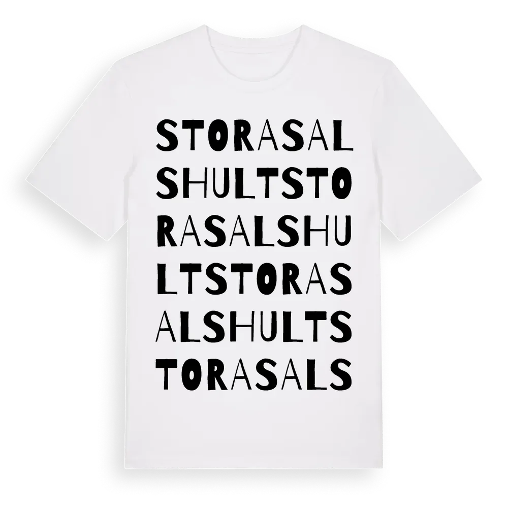 Stora Salshult ordlek t-shirt är inspirerad av Stora Salshult i Jönköpings län, Sverige. Tröjan är designad för dig som har en speciell koppling till platsen – oavsett om du bor här, har rötterna här eller bara älskar Stora Salshult.