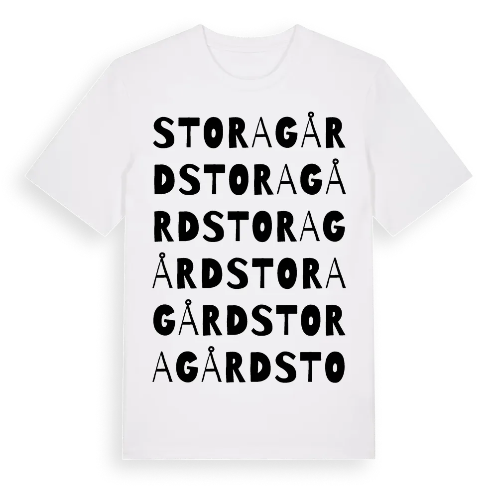 Storagård ordlek t-shirt är inspirerad av Storagård i Jönköpings län, Sverige. Tröjan är designad för dig som har en speciell koppling till platsen – oavsett om du bor här, har rötterna här eller bara älskar Storagård.