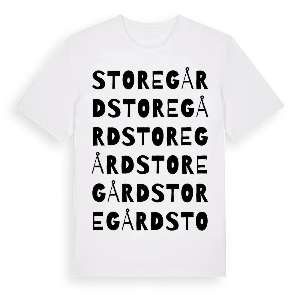 Storegård ordlek t-shirt är inspirerad av Storegård i Jönköpings län, Sverige. Tröjan är designad för dig som har en speciell koppling till platsen – oavsett om du bor här, har rötterna här eller bara älskar Storegård.