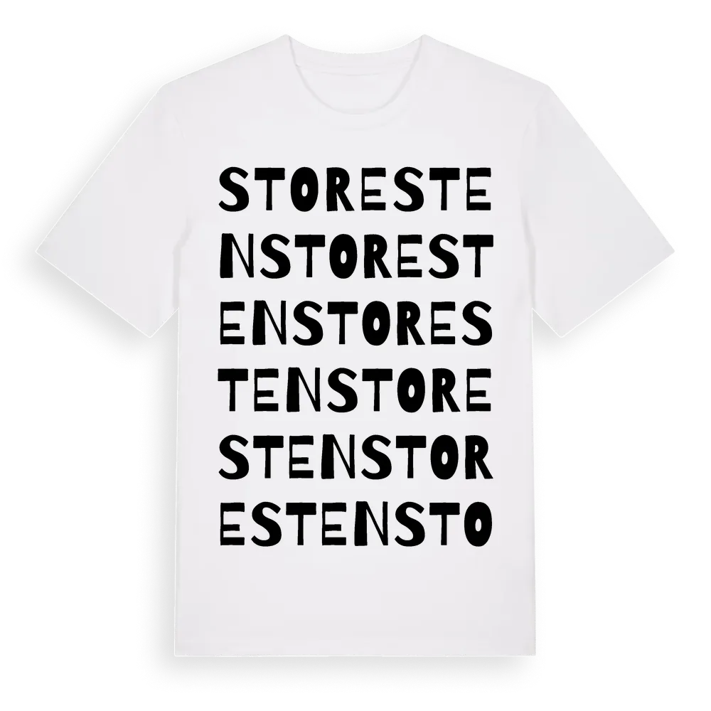 En ordlek byggd på Storestens namn. Subtilt och klurig – ett motiv som bara de som verkligen känner platsen fullt ut förstår. Premium bomull, unisex – från byn Storesten i Jönköpings län.
