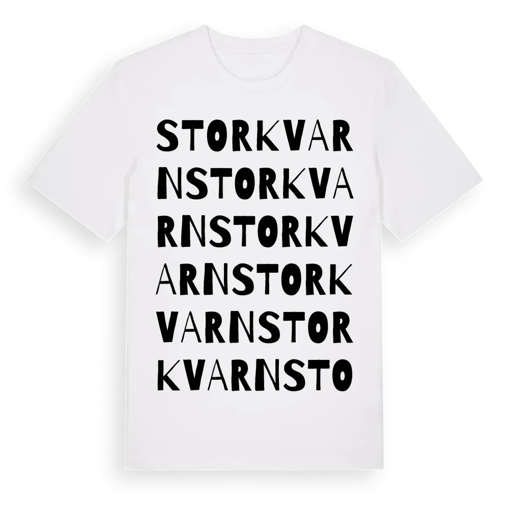 Storkvarn ordlek t-shirt är inspirerad av byn Storkvarn i Jönköpings län, Sverige. Tröjan är designad för dig som har en speciell koppling till platsen – oavsett om du bor här, har rötterna här eller bara älskar Storkvarn.