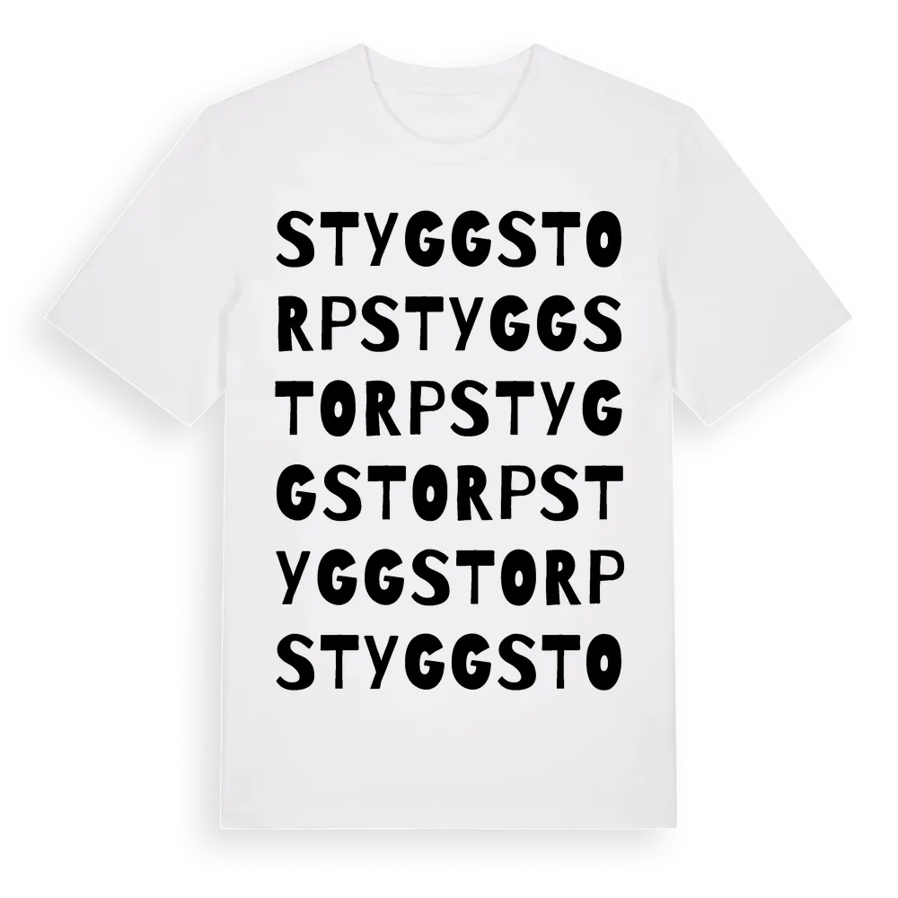 Styggstorp ordlek t-shirt är inspirerad av byn Styggstorp i Jönköpings län, Sverige. Tröjan är designad för dig som har en speciell koppling till platsen – oavsett om du bor här, har rötterna här eller bara älskar Styggstorp.