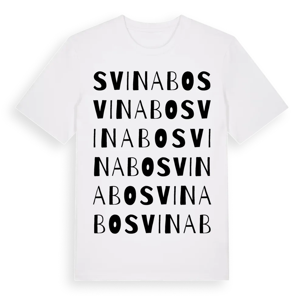 Svinabo ordlek t-shirt är inspirerad av byn Svinabo i Jönköpings län, Sverige. Tröjan är designad för dig som har en speciell koppling till platsen – oavsett om du bor här, har rötterna här eller bara älskar Svinabo.
