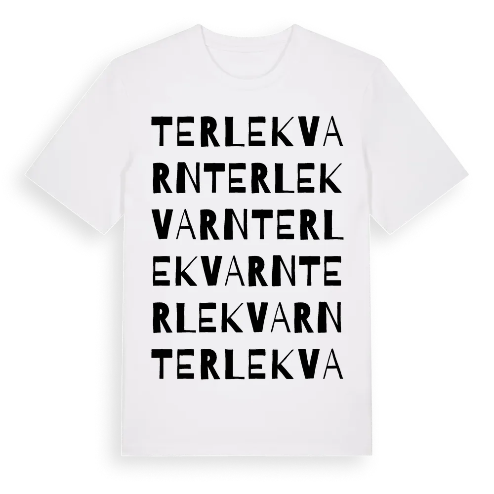 Terlekvarn ordlek t-shirt är inspirerad av Terlekvarn i Jönköpings län, Sverige. Tröjan är designad för dig som har en speciell koppling till platsen – oavsett om du bor här, har rötterna här eller bara älskar Terlekvarn.